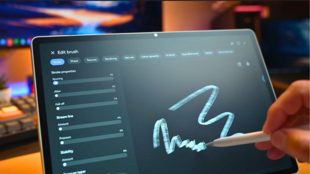- Useful stylus gestures (pinch for tools, rotation changes brush direction) plus a button for jumping into apps