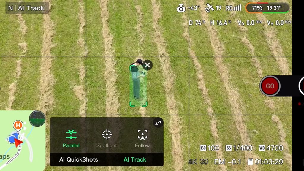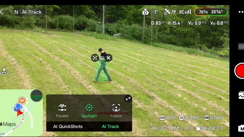 • In Parallel mode, the drone will not track you if you’re at a different elevation than where the drone took off. If you take off and then walk uphill, it can throw an error unless you go to a lower altitude or land and take off again. This isn’t a huge elevation change, maybe 20 or 30 feet, but it still won’t work.