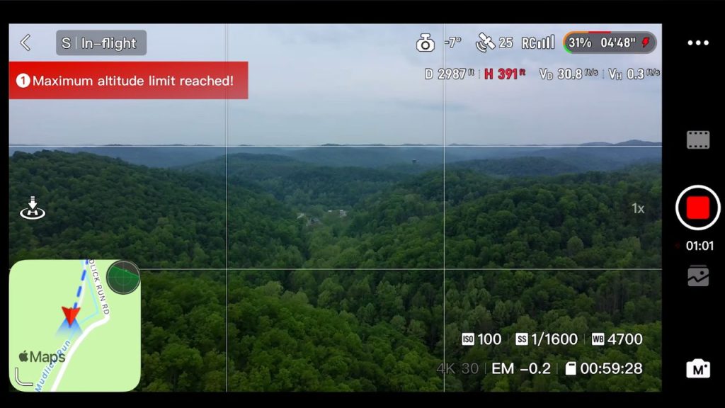 When the battery hits 30%, you lose Sport mode, so you can’t fly anywhere close to max speed. I don’t know if it’s to protect the battery, but it’s frustrating because when the battery is low, I often want to fly back faster. I’ve seen drones reduce throttle output, but I’ve never seen one reduce maximum flight speed like this.